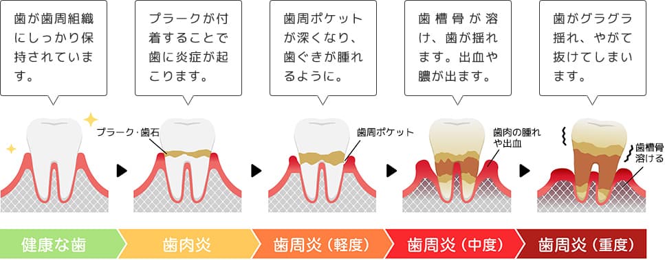 歯周病は日本の成人の約8割がかかっているといわれる身近な病気です。しかし自覚症状が出にくいため、気が付く頃には歯を支える骨が溶けてしまっていることも。最悪の場合には、歯が抜けてしまうこともある恐ろしい病気です。「もしかして…」という症状がある方はお早めにご相談ください。